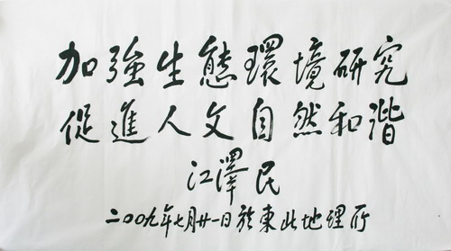 11時30分,江澤民健步來到我所科研大樓的大廳中間,揮毫題詞:“加強生態環境研究,促進人文自然和諧”。這十六個遒勁的大字,將極大地促進我所的知識創新工程工作,為國家科技事業和地方經濟發展做出更大貢獻!