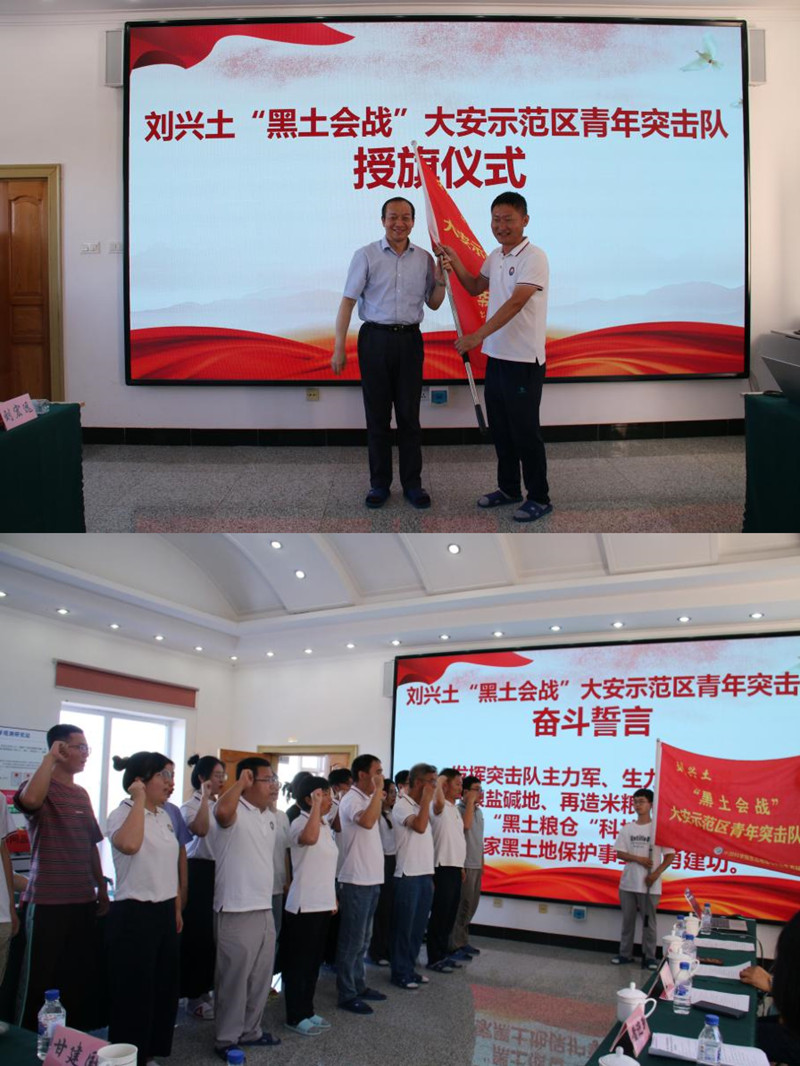 座談會(huì)上舉辦了以老科學(xué)家命名的突擊隊(duì)授旗儀式。文波龍副研究員簡要介紹劉興土院士先進(jìn)事跡,李和風(fēng)向劉興土“黑土?xí)?zhàn)”大安示范區(qū)青年突擊隊(duì)授旗,青年突擊隊(duì)進(jìn)行奮斗誓言宣誓,錚錚誓言,體現(xiàn)了新一代的科研工作者以老科學(xué)家精神為引領(lǐng),緊密圍繞國家重大戰(zhàn)略需求奮勇建功的信心和決心。