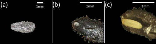 圖2 Anigozanthos flavidus種子萌發(fā)過程中胚的變化動態(tài)(a)完整的種子, (b)萌動前的胚, (c) 萌發(fā)前伸長的胚