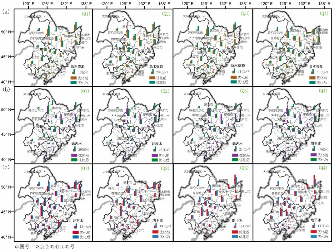 ▲優(yōu)化前后東北黑土區(qū)水資源開(kāi)發(fā)利用對(duì)比分析(a)總水資源量(b)地表水資源量(c)地下水資源量(Q1:平水年常規(guī)灌溉,Q2:平水年節(jié)水灌溉,Q3:枯水年常規(guī)灌溉,Q4:枯水年節(jié)水灌溉)(圖片來(lái)源:中國(guó)科學(xué)院東北地理與農(nóng)業(yè)生態(tài)研究所)