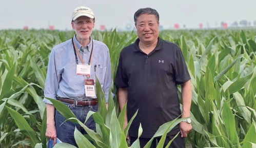 吉林省農(nóng)業(yè)科學(xué)院全國(guó)玉米栽培和黑土地保護(hù)專家王立春(右)在公主嶺黑土地保護(hù)實(shí)驗(yàn)基地接待美國(guó)土壤學(xué)會(huì)理事長(zhǎng)湯普森,為其講解吉林省黑土地保護(hù)技術(shù)。