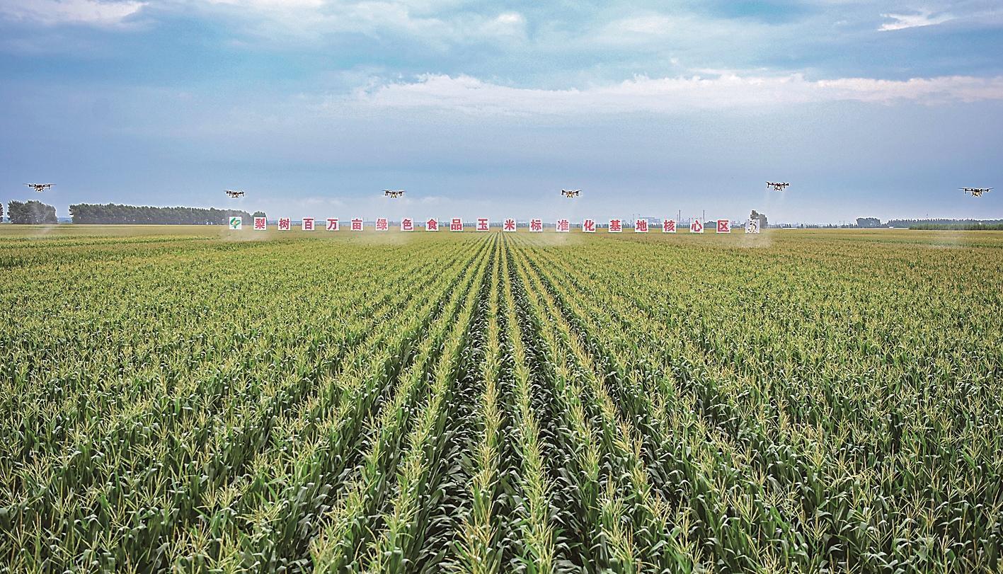 在梨樹(shù)縣國(guó)家百萬(wàn)畝綠色食品原料(玉米)標(biāo)準(zhǔn)化生產(chǎn)基地核心示范區(qū),工作人員開(kāi)展植保無(wú)人機(jī)飛防作業(yè)。 本報(bào)記者 趙博 攝