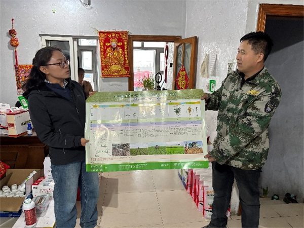 鄒文秀(左)向鄉(xiāng)鎮(zhèn)農(nóng)技人員發(fā)放技術掛圖。