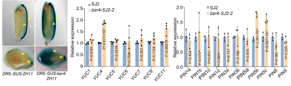 ▲OsBZR4功能缺失導(dǎo)致種子中生長(zhǎng)素合成和分布異常
