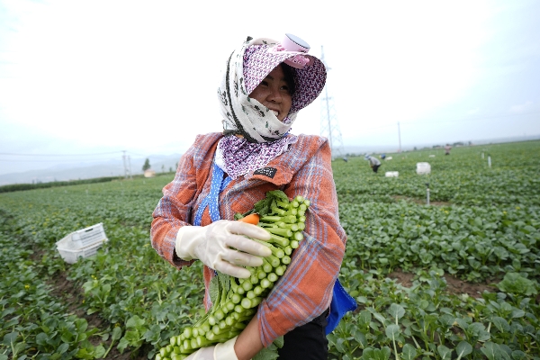 工作人員在寧夏固原市原州區彭堡鎮采摘菜心。新華社記者王鵬攝