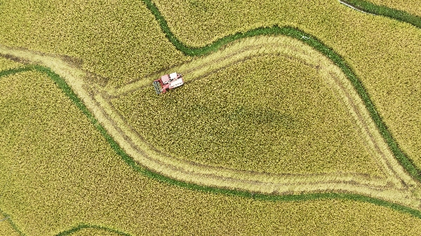 農機手駕駛聯合收割機在貴州省綏陽縣旺草鎮收割水稻(無人機照片)。新華社發(李前勇攝)