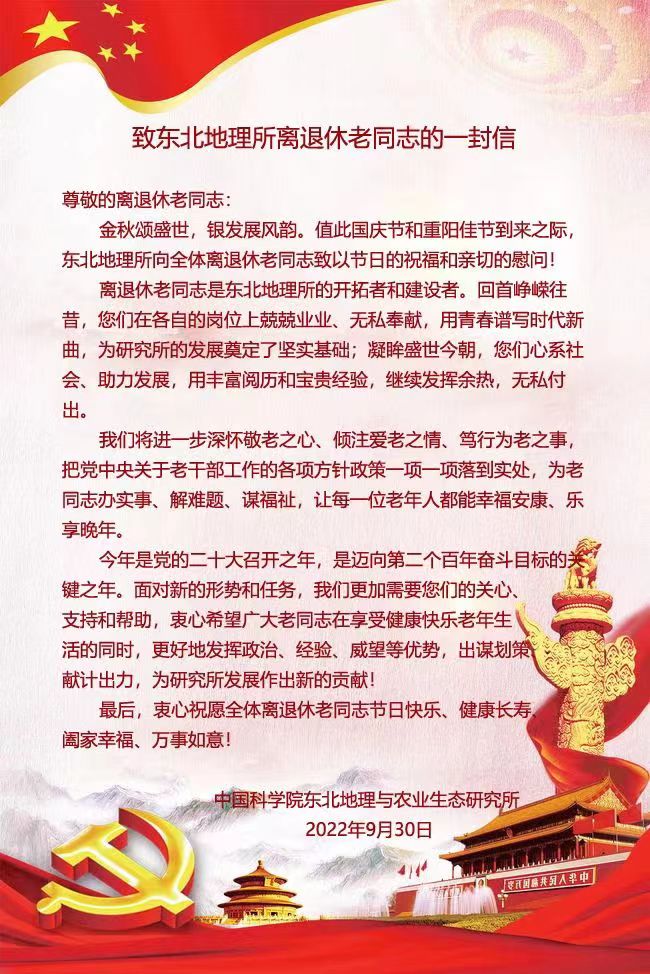 金秋十月,神州大地天清氣朗,山河錦繡。中國(guó)共產(chǎn)黨第二十次全國(guó)代表大會(huì)在舉世矚目中圓滿完成各項(xiàng)議程和崇高使命,歷時(shí)7天勝利閉幕。這是一次舉旗定向、凝聚力量、團(tuán)結(jié)奮進(jìn)的大會(huì),在黨和國(guó)家發(fā)展進(jìn)程中具有極其重大的歷史意義。東北地理所作為國(guó)家戰(zhàn)略科技力量,深入理解和準(zhǔn)確把握黨的二十大提出的各項(xiàng)工作部署至關(guān)重要。所黨委從迎接黨的二十大到學(xué)習(xí)宣傳貫徹黨的二十大精神都做出了明確的部署和具體的安排。針對(duì)離退休干部隊(duì)伍的特點(diǎn),東北地理所組織開(kāi)展形式多樣的活動(dòng),迎接黨的二十大和學(xué)習(xí)宣傳貫徹黨的二十大精神,切實(shí)引領(lǐng)離退休干部感黨恩、聽(tīng)黨話、跟黨走,為黨的事業(yè)傳播好聲音、匯聚正能量、作出新貢獻(xiàn)。