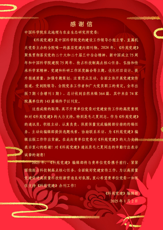 近日,東北地理所收到《科苑黨建》發(fā)來的感謝信,感謝所黨委對黨建宣傳工作的高度重視和對《科苑黨建》的大力支持,對《科苑黨建》通訊員的辛勤付出表示誠摯的謝意!