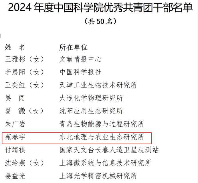 為表彰先進、樹立典型,激勵團青組織和廣大團員、團干部奮勇爭先、再創佳績。近日,中國科學院團委發文對29個五四紅旗團委、30個五四紅旗團支部、50名優秀共青團干部、100名優秀團員青年進行表彰。中國科學院東北地理與農業生態研究所團委書記苑春宇榮獲“2024年度優秀共青團干部”稱號、2023級博士研究生常瀟榮獲“2024年度中國科學院優秀共青團員”稱號。