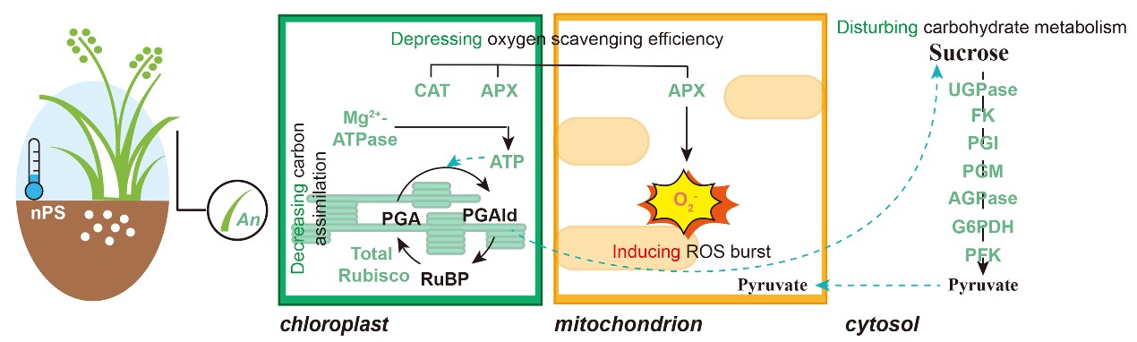 利用熒光顯微鏡觀察發現,經熒光標記納米塑料處理的大麥植株葉片的原生質體中具有熒光,表明納米塑料進入植物細胞。在低溫脅迫下,納米塑料顆粒處理的大麥植株葉片具有更小的凈光合速率。進一步提取葉綠體后發現,納米塑料顆粒處理降低了Mg2+-ATPase和核酮糖-1.5-二磷酸羧化酶/加氧酶(Rubisco)活性,引起ATP 含量下降。以上結果表明,納米塑料顆粒處理干擾了低溫脅迫下大麥的光合碳同化,加劇了能量物質失衡。接下來,研究人員對植物糖酵解過程進行了研究,發現納米塑料顆粒處理降低了低溫脅迫下大麥葉片中UDP-葡萄糖焦磷酸化酶(UGPase)、ADP-葡萄糖焦磷酸化酶(AGPase) 、磷酸葡萄糖變位酶(PGM)、磷酸葡萄糖異構酶(PGI)、6-磷酸葡萄糖脫氫酶(G6PDH)、果糖激酶(FK)、磷酸果糖激酶(PFK)活性,進一步擾亂植物碳水化合物代謝。該試驗還通過提取葉綠體和線粒體,在亞細胞水平上對低溫和納米塑料顆粒引起的氧化脅迫進行了研究。研究表明,納米顆粒引起了低溫脅迫下植物葉片線粒體中活性氧(ROS)的累積,并且使葉綠體中過氧化氫酶(CAT)、抗壞血酸過氧化物酶(APX)以及線粒體中APX活性降低,降低ROS清除效率。