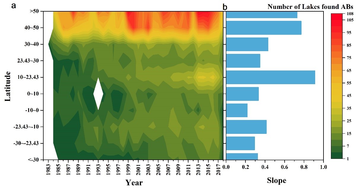 圖1 1982年–2018年間全球不同緯度地區(qū)湖泊藻華暴發(fā)情況;(a)暴發(fā)藻華的湖泊數(shù)量(b)藻華暴發(fā)情況隨時間變化的線性回歸斜率系數(shù)(p <0.05)