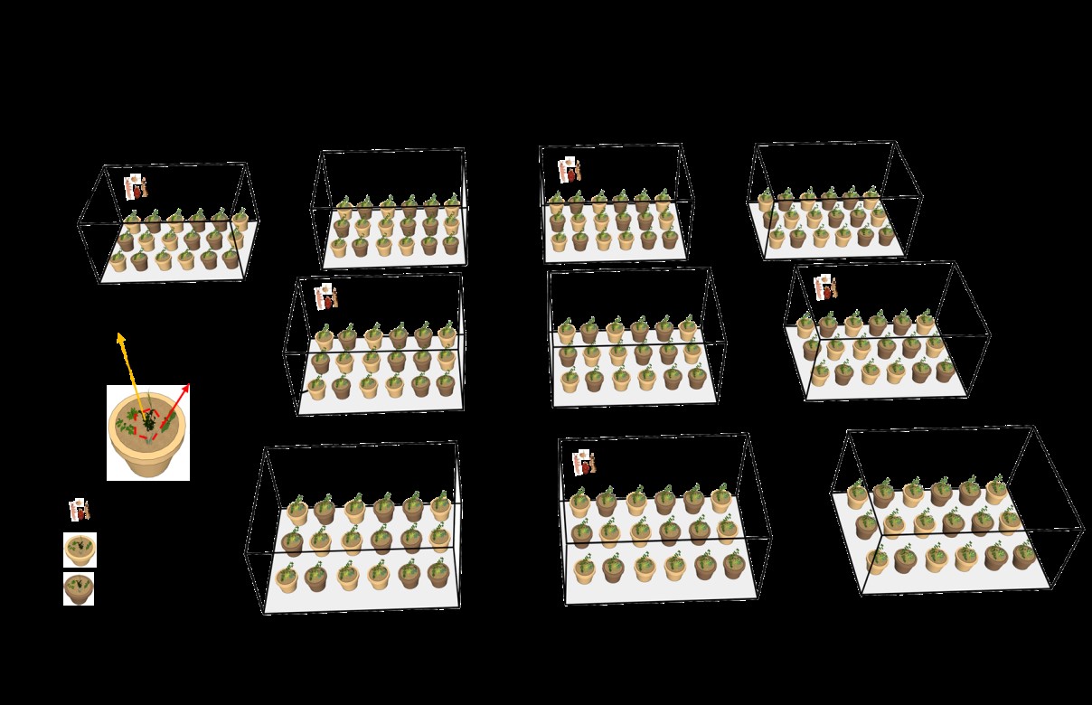 基于以上科學假設,中國科學院東北地理與農業生態研究所生物入侵生態學研究團隊設計了一個溫室盆栽實驗(圖1)。本實驗將9種外來入侵植物作為目標種,分別種植在由5種本地植物組成的群落中,并對其進行干旱 × 中型土壤動物接種的全因子處理。