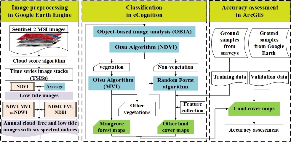 針對以上困難,中國科學院東北地理所地理景觀遙感學科組研究人員,基于28,323景Sentinel-2影像構建了2016-2020年高質量(無云低潮)逐年影像數據集。集成OTSU圖像自適應分割閾值算法、隨機森林算法(RF)和面向對象方法(OBIA),提出了一種高效、高精度的紅樹林及其周邊土地覆蓋類型自動提取方法?;诖朔椒嫿?016-2020年中國國家級自然保護區內的紅樹林與其周邊土地覆蓋類型的逐年空間分布數據集,解析了紅樹林空間分布格局年際變化及其轉化。