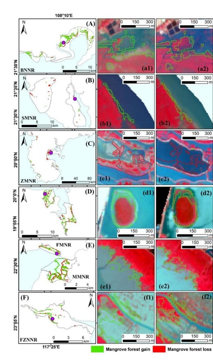 ?。ˋ-E:2016-2020年保護區紅樹林總體變化,a1-f1,a2-f2分別為2016和2020年各保護區內典型紅樹林變化)