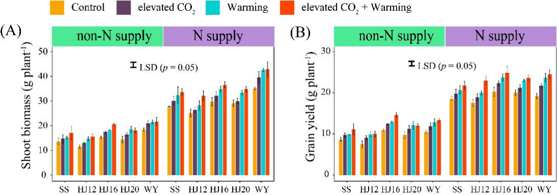 圖1 大氣CO2濃度和溫度升高條件下5個品種水稻的生物量(A)和產(chǎn)量(B)