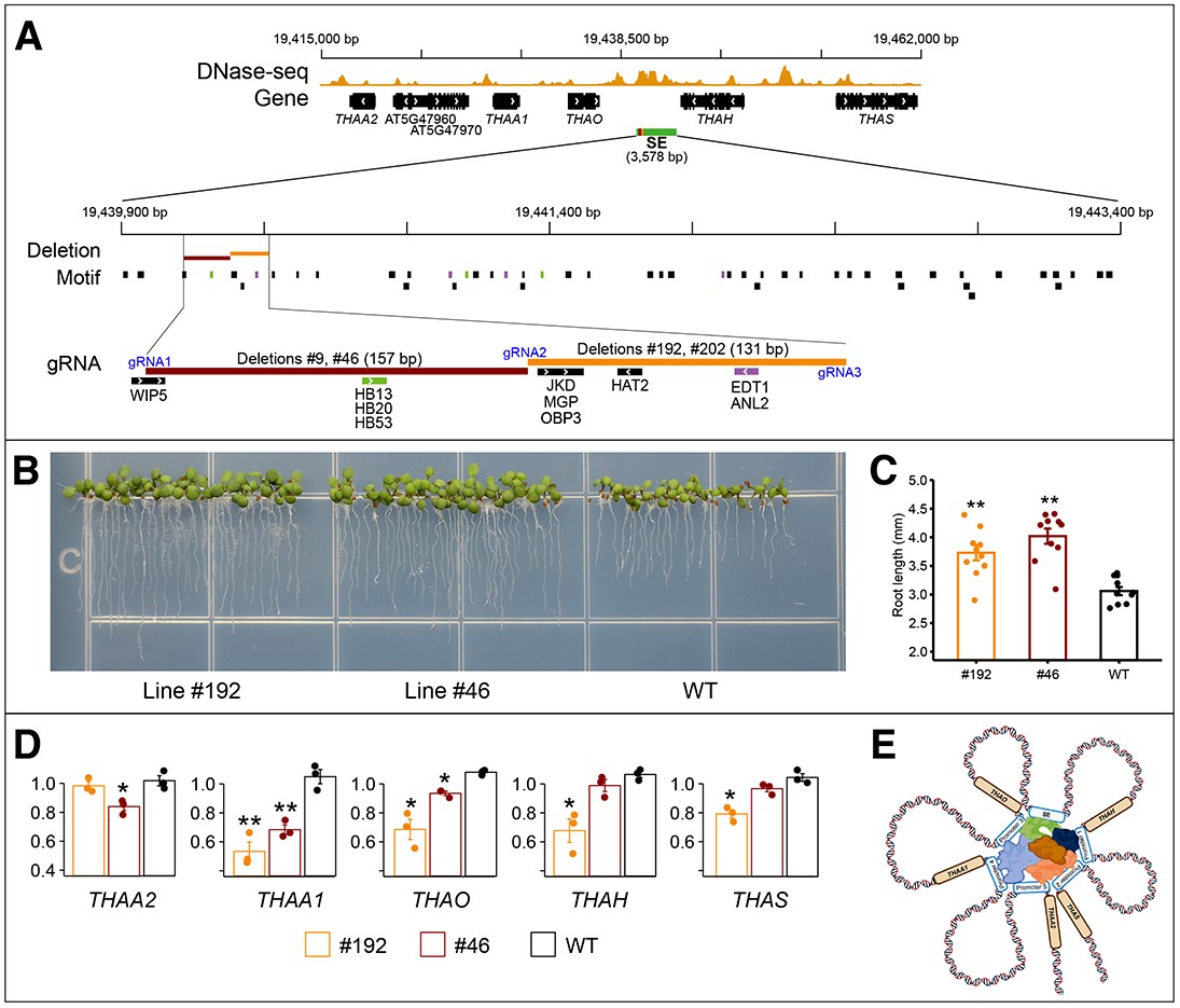 孟凡立研究員團隊利用擬南芥DNase I超敏感位點測序數據,在擬南芥全基因組范圍內查找含有大的增強子簇的染色質開放區域,鑒定出749個候選超級增強子,最小的長度為1.5Kb。超級增強子所在基因組區域比其他啟動子染色體開放區域對DNase I更敏感。超級增強子與拓撲關聯域(TAD)緊密相關聯(圖1)。SEs及其預測靶基因與擬南芥器官和組織發育密切相關。這些研究結果證明擬南芥超級增強子與哺乳動物超級增強子具有相同的功能特征。在由五個基因組成thalianol生物合成基因簇(BGC)中間定位了一個長3578 bp超級增強子,并利用CRISPR/Cas技術創制超級增強子的突變體。超級增強子中131-157 bp小片段缺失顯著抑制基因簇中五個基因轉錄,導致擬南芥根明顯變長(圖2)。此外,SE區域中T-DNA插入也導致基因簇五個基因轉錄改變。該研究結果表明超級增強子在擬南芥組織發育特性相關基因表達和類操縱子基因簇基因共表達中發揮著重要作用。
