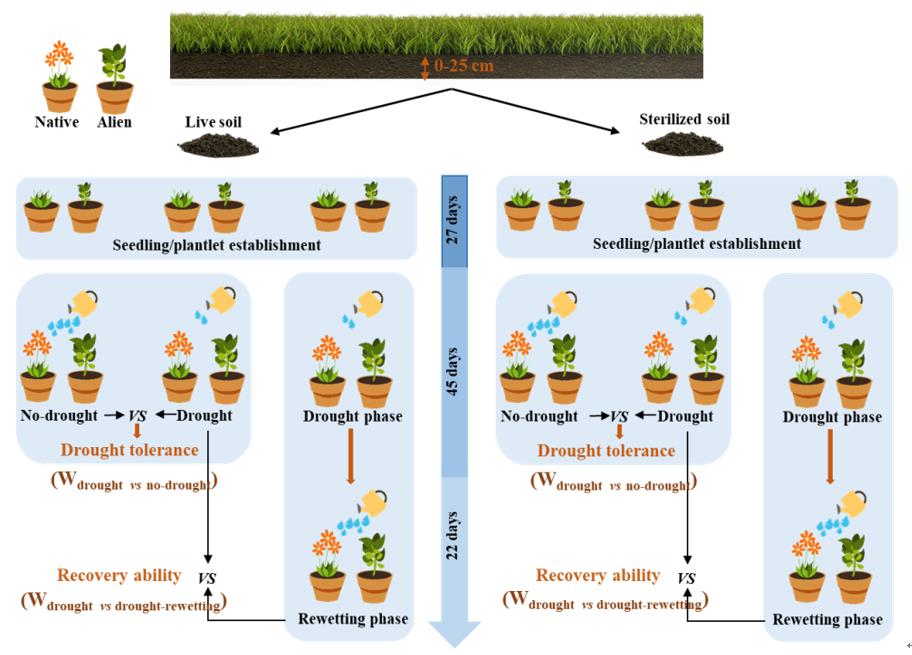 基于以上研究空白,中科院東北地理所生物入侵生態學研究團隊設計了一個溫室盆栽實驗(圖1):將4對同屬的外來入侵植物與本地植物單獨種植,并對其進行水分控制(正常澆水 vs. 干旱 vs. 干旱-再濕潤處理) × 土壤滅菌(滅菌 vs. 不滅菌)的全因子處理。