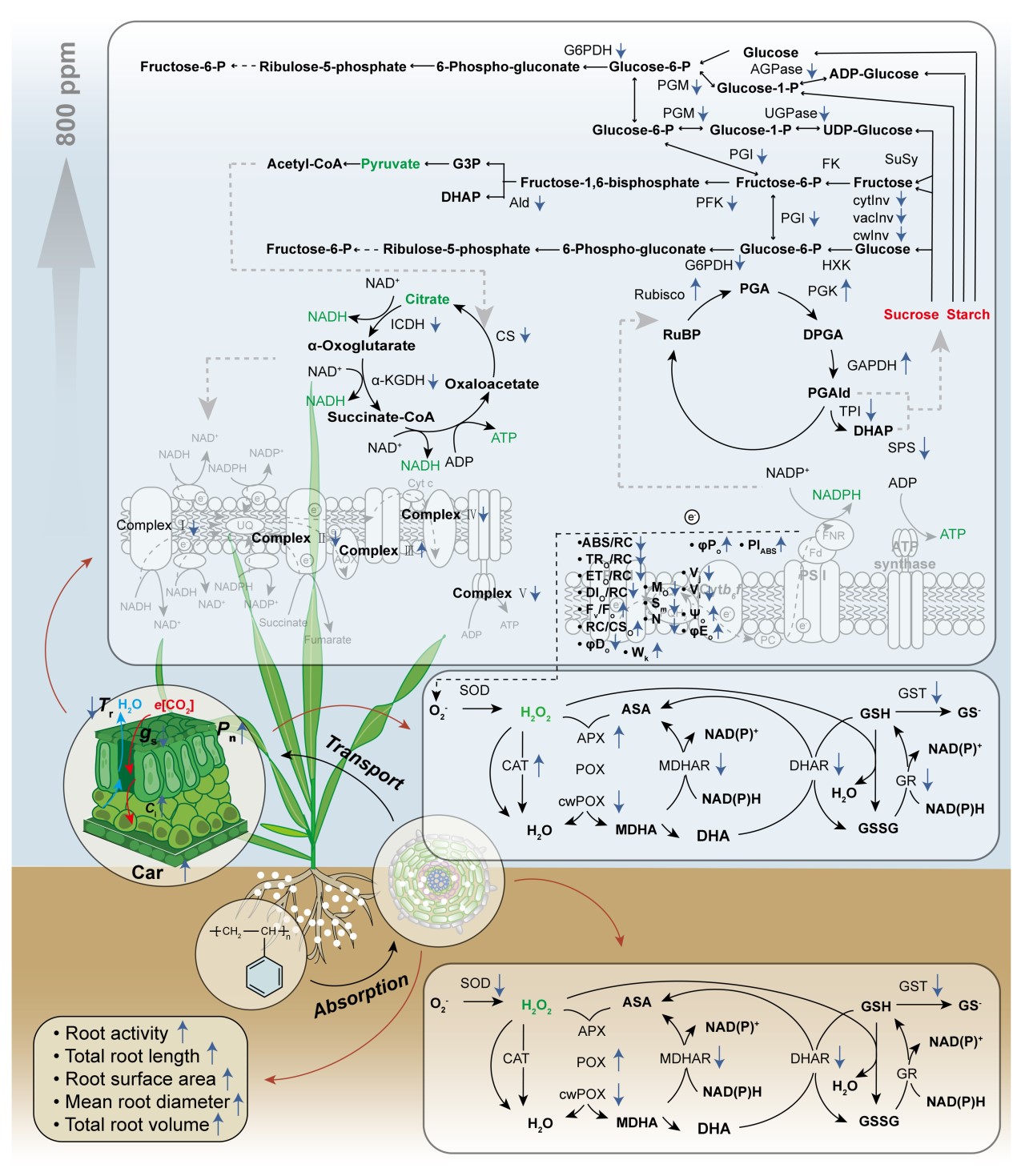 圖1. 大麥響應納米塑料和大氣CO2濃度升高的生理響應機制