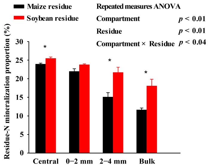 圖1. 根箱各隔層土壤中玉米和大豆秸稈氮的礦化比例
