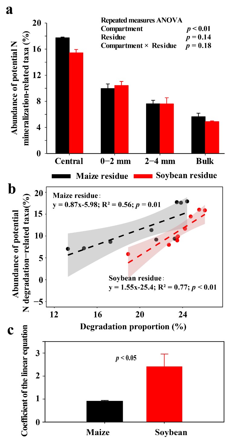 圖2. 秸稈氮礦化相關(guān)微生物豐度總和(a),玉米和大豆秸稈添加下N礦化微生物相對豐度與秸稈氮礦化的相關(guān)關(guān)系(b)及斜率(c)