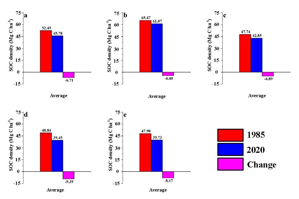 圖1東北地區(qū)35年來土壤有機碳密度變化(a代表東北地區(qū);b代表黑龍江省;c代表吉林??;d代表遼寧?。籩代表內(nèi)蒙古)