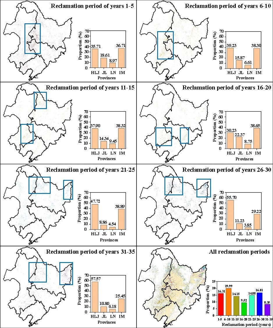 圖2東北地區(qū)耕地開墾結(jié)果(藍色邊框表示不同開墾年限大范圍分布區(qū)域)
