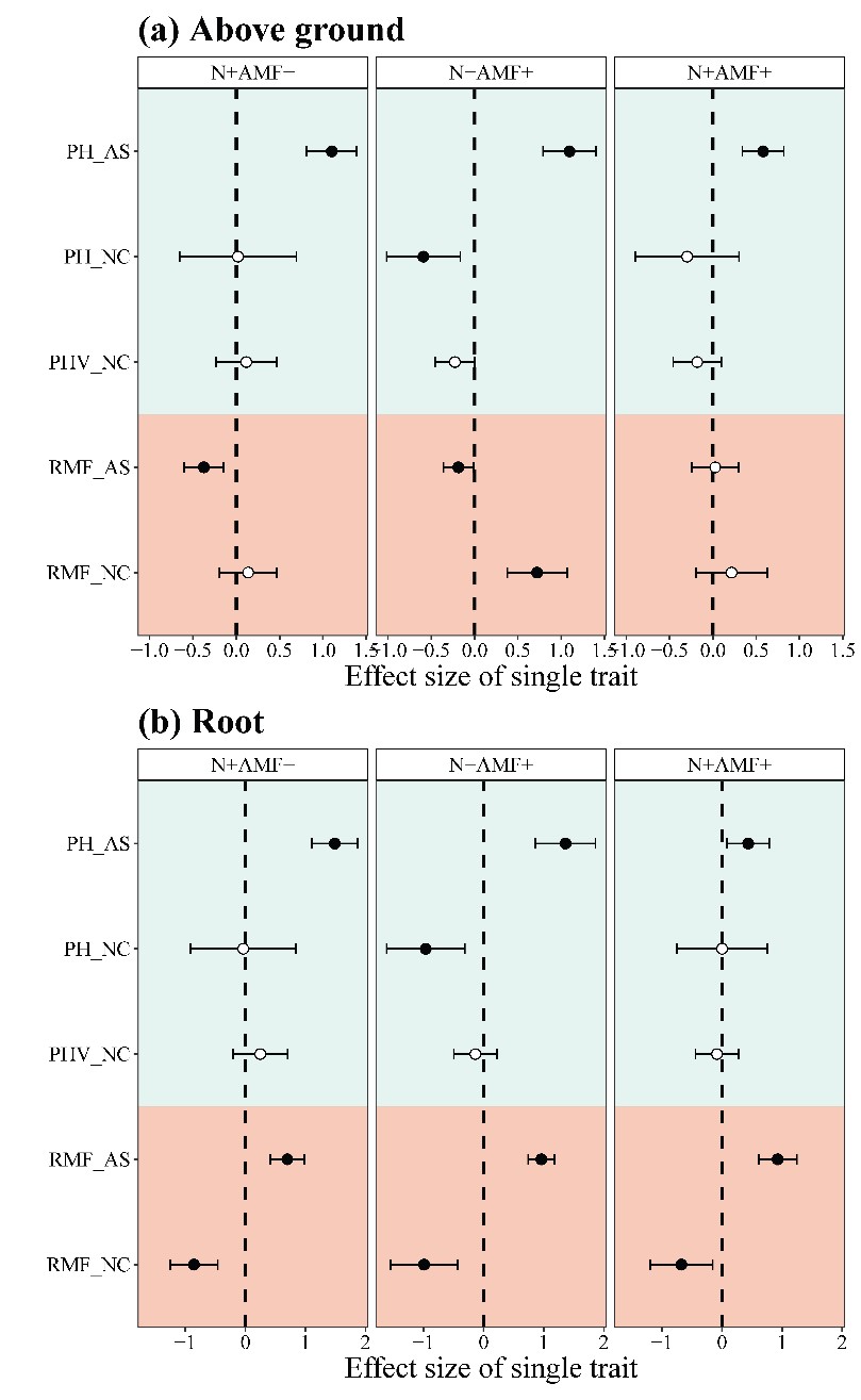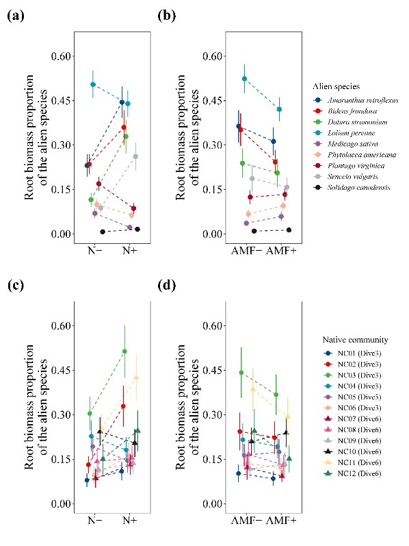 基于這一背景,中國科學院東北地理與農業生態研究所和東北師范大學的研究人員,以9種入侵植物和12個人工群落(兩個多樣性梯度)構建的108個入侵系統為目標,結合養分添加和AMF添加處理,探究了不同生物和非生物環境下生物多樣性阻抗入侵的機制。