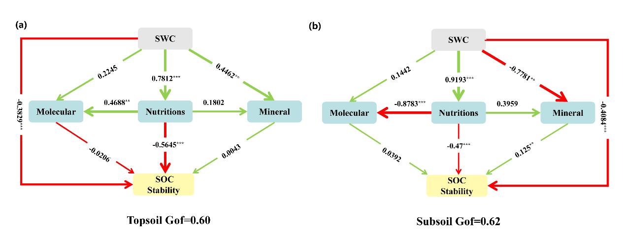 研究結果表明:在表層土壤中(0-20cm),Fe、Mn礦物保護和分子抗性(熱裂解產物)分別解釋了土壤有機碳穩定性的16% 和 14%,隨機森林分析結果顯示微生物對其穩定性也有著重要的貢獻;而底層土壤(>20cm),Fe、Mn礦物保護和分子抗性分別解釋了9% 和 26%,這表明分子抗性在底土中對有機碳穩定性發揮著更為關鍵的作用。同時,我們發現植物來源的碳輸入對底土中的 SOC 穩定性有重要貢獻。礦物保護與分子抗性二者的交互作用在控制 SOC 穩定性方面發揮了重要作用,分別解釋了表土和底土有機碳穩定性的25% 和 39%,這說明這種交互作用在底土中更為重要。