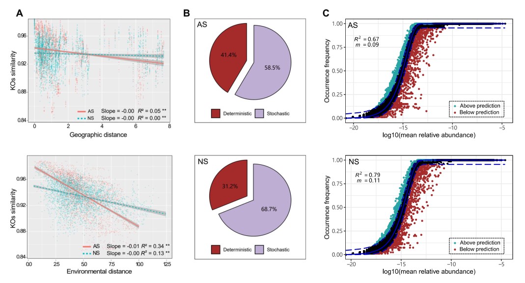 東北地理所農(nóng)田分子生態(tài)學(xué)科組科研人員采集了黑土區(qū)未開墾的自然土壤和毗鄰的農(nóng)田土壤,采用宏基因組測序方法對(duì)兩種土地利用方式下的功能基因多樣性、組成和裝配過程進(jìn)行了解析,以未墾殖的黑土為參比,探討了退化農(nóng)田土壤驅(qū)動(dòng)的功能基因群落分異與土壤養(yǎng)分循環(huán)的作用機(jī)制。與以往認(rèn)知相悖,本研究發(fā)現(xiàn)農(nóng)田土壤功能基因的多樣性顯著高于自然土壤,農(nóng)田土壤中更豐富的功能基因多樣性有助于農(nóng)田生態(tài)系統(tǒng)提升對(duì)環(huán)境脅迫的恢復(fù)力,而自然土壤較低的功能多樣性可能歸因于可用資源限制和物種運(yùn)動(dòng)限制,導(dǎo)致特定土壤生態(tài)過程減少(圖1)。通常認(rèn)為農(nóng)田管理方式下土壤生境的均一化會(huì)降低土壤微生物功能的異質(zhì)性,然而我們發(fā)現(xiàn)農(nóng)田土壤功能基因的空間異質(zhì)性顯著高于自然土壤,其主要是由于農(nóng)田土壤功能基因?qū)Νh(huán)境和土壤因子的響應(yīng)強(qiáng)于自然土壤。此外,自然土壤受隨機(jī)性過程影響程度高于農(nóng)田土壤,導(dǎo)致自然土壤功能基因具有更高的相似度(圖2)。