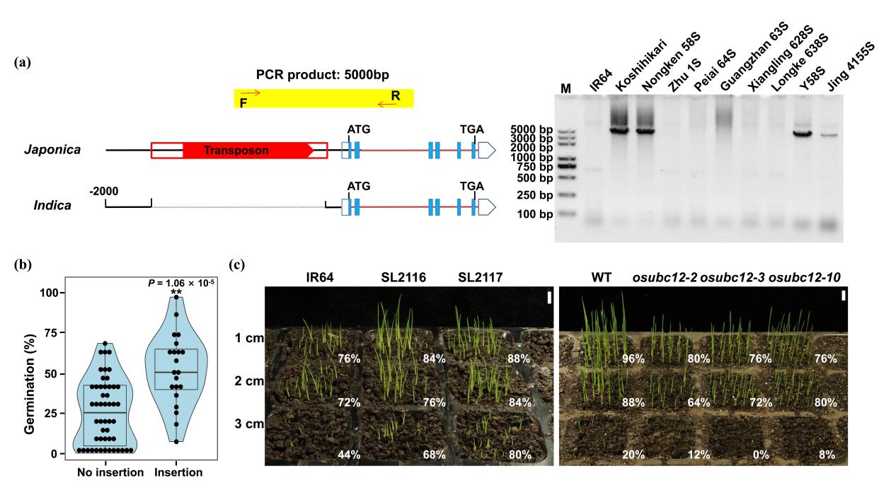 近日,東北地理所方軍研究員團(tuán)隊(duì)關(guān)于水稻低溫萌發(fā)的最新研究成果刊發(fā)在國(guó)際綜合性期刊頂級(jí)B刊Nature Communications(IF=16.6)上。研究發(fā)現(xiàn),E2泛素耦合酶基因OsUBC12啟動(dòng)子中轉(zhuǎn)座子的插入能夠顯著提高其轉(zhuǎn)錄水平,進(jìn)而增強(qiáng)粳稻的低溫萌發(fā)能力,并進(jìn)一步揭示了UBC12調(diào)控水稻低溫萌發(fā)的潛在機(jī)制,為培育適合直播特性水稻品種提供了基因及種質(zhì)資源。