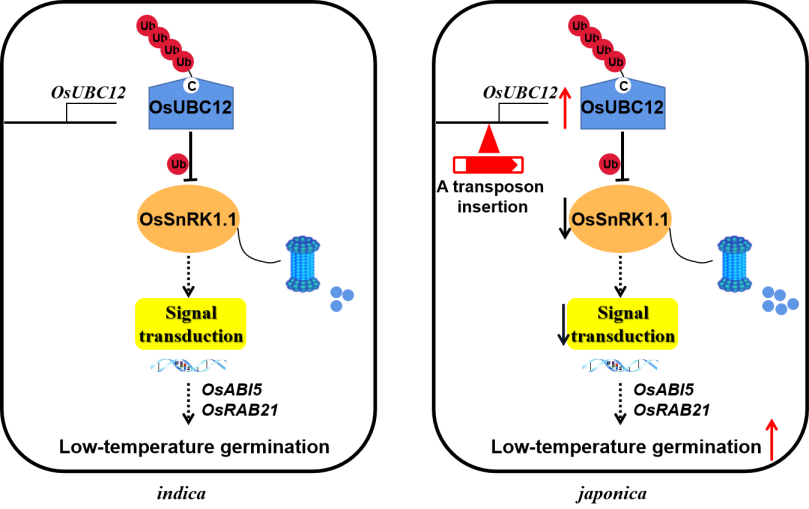 基于以上結(jié)果,該研究提出了OsUBC12參與調(diào)控水稻低溫萌發(fā)的工作模型(圖4):OsSnRK1.1作為下游的關(guān)鍵調(diào)節(jié)因子,通過上調(diào)ABA信號(hào)抑制低溫萌發(fā)。OsUBC12主要催化K48-多聚泛素化修飾,能夠招募OsSnRK1.1并促進(jìn)OsSnRK1.1的降解。與秈稻相比,粳稻OsUBC12啟動(dòng)子中轉(zhuǎn)座子的插入顯著激活OsUBC12的表達(dá)。而豐度提高的OsUBC12蛋白進(jìn)一步促進(jìn)OsSnRK1.1的降解,從而削弱OsSnRK1.1調(diào)節(jié)的ABA信號(hào)傳導(dǎo),增強(qiáng)粳稻的低溫萌發(fā)能力。
