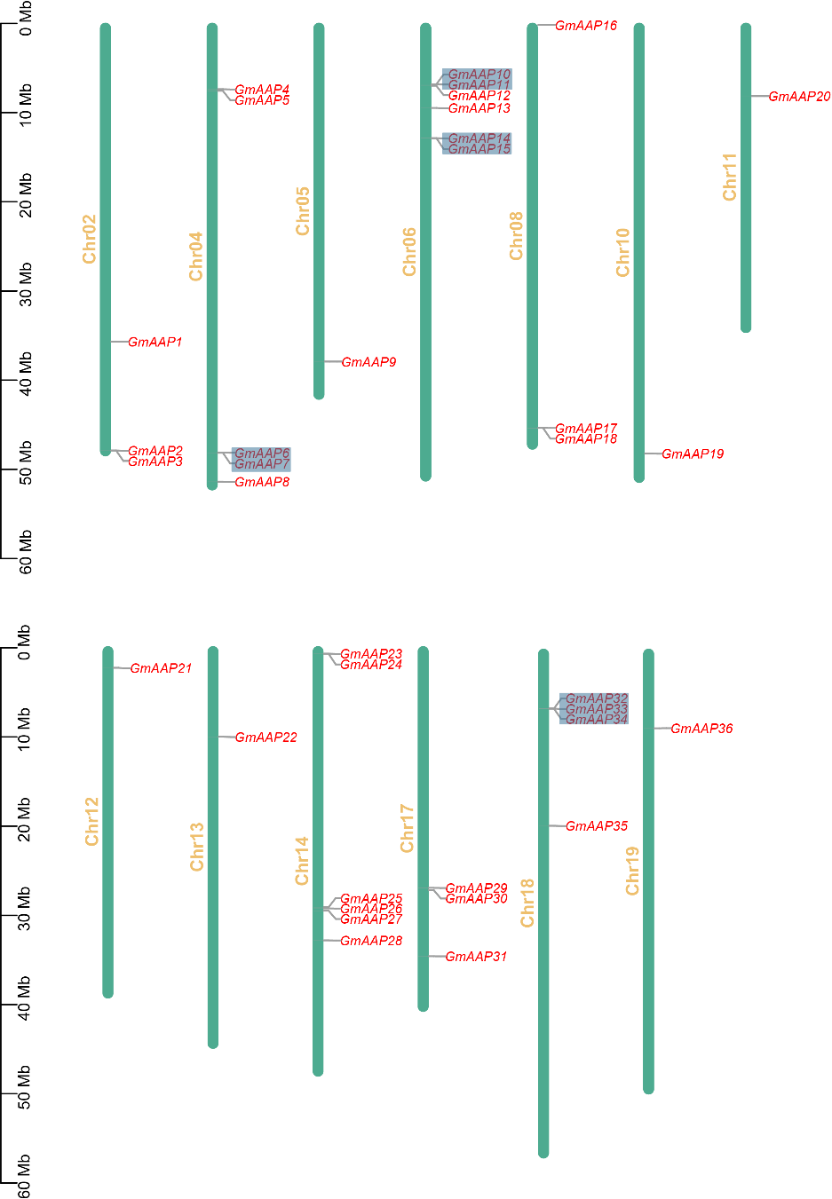 圖1 GmAAP基因家族在染色體上的位置