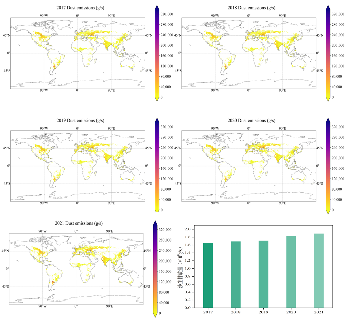 圖1 2017-2021年全球農(nóng)田風(fēng)蝕顆粒物排放時空分布特征
