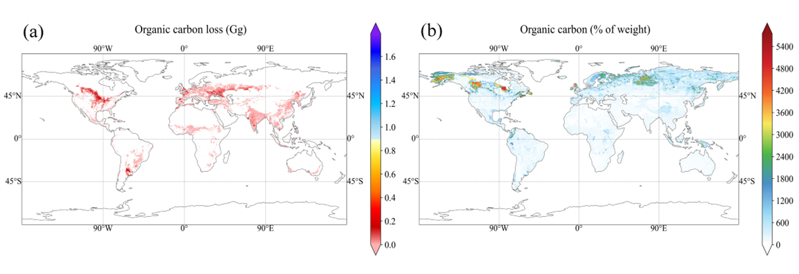 圖2 全球農(nóng)田土壤有機(jī)碳含量及由土壤風(fēng)蝕帶來的有機(jī)碳損失