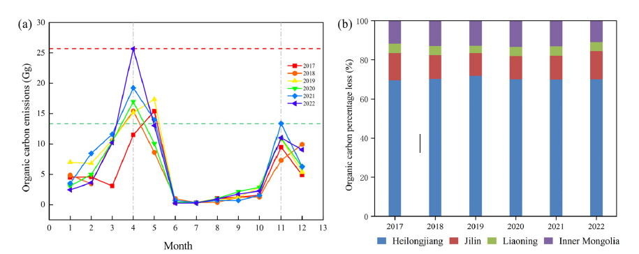 而對我國東北黑土地的研究顯示,2017-2022年東北地區(qū)由農(nóng)田風(fēng)蝕導(dǎo)致的有機(jī)碳損失量約80.45Gg/年,且整體呈現(xiàn)逐年增加的趨勢。在全年范圍內(nèi),農(nóng)田風(fēng)蝕的有機(jī)碳損失呈雙峰分布,其中每年播種前的4月份為有機(jī)碳碳損失最多的月份,而收獲后完全凍結(jié)前的11月份為有機(jī)碳損失的第二個高峰期(圖3)。可見,東北農(nóng)田風(fēng)蝕有機(jī)碳損失受季節(jié)性天氣特征和地表裸露的影響,增加4月和11月的地表覆蓋可減少東北黑土地因農(nóng)田風(fēng)蝕帶來的碳損失。此外,為減少東北黑土地在大氣傳輸過程中的碳損失,研究人員建議在東北地區(qū)建立Y型秸稈焚燒和農(nóng)田風(fēng)蝕綜合一體化監(jiān)測體系,以便于實(shí)時跟蹤、協(xié)同減排,促進(jìn)跨省聯(lián)防聯(lián)控。