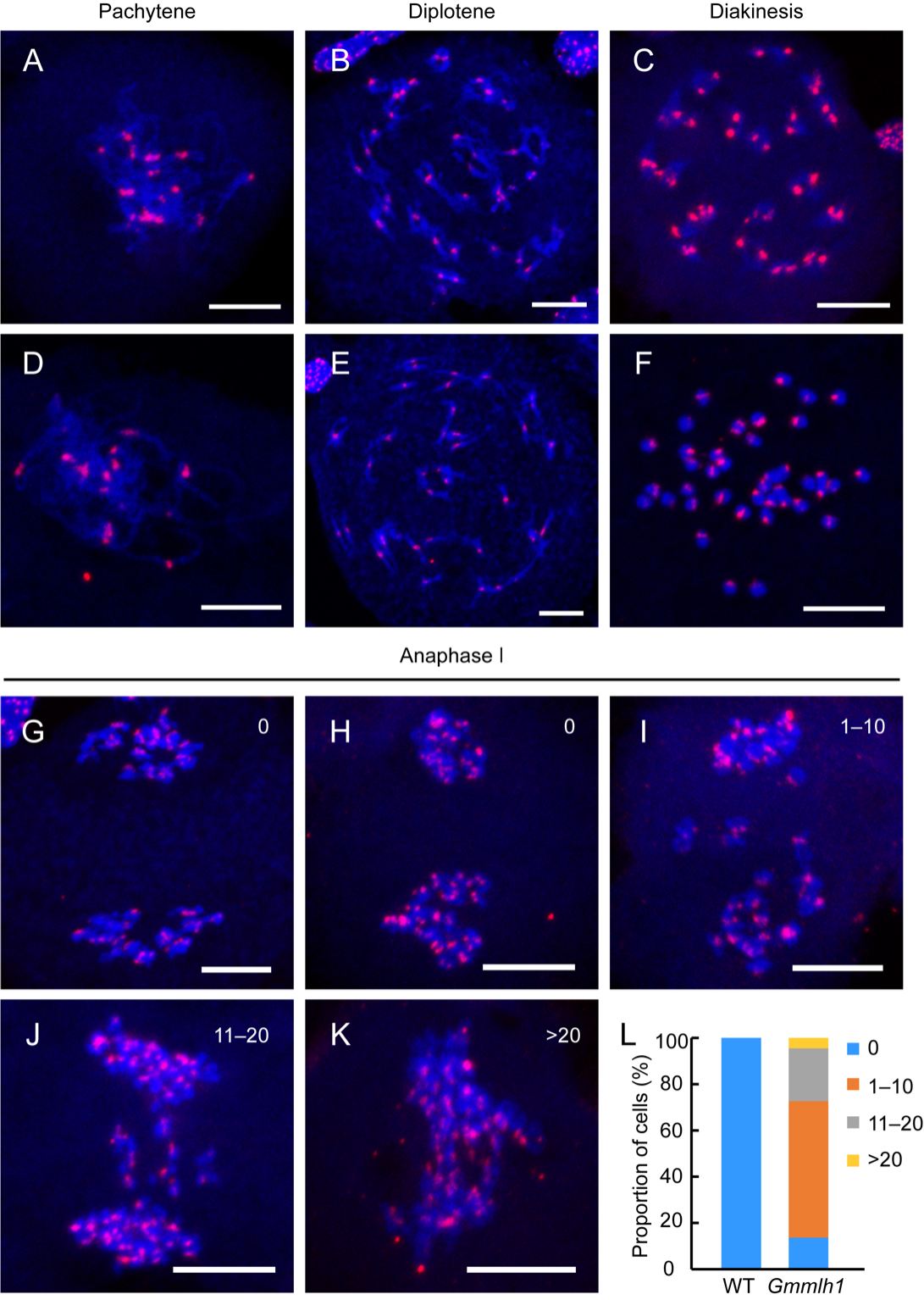 圖1. 熒光原位雜交分析大豆Gmmlh1突變體中單價體和后期Ⅰ滯后染色體