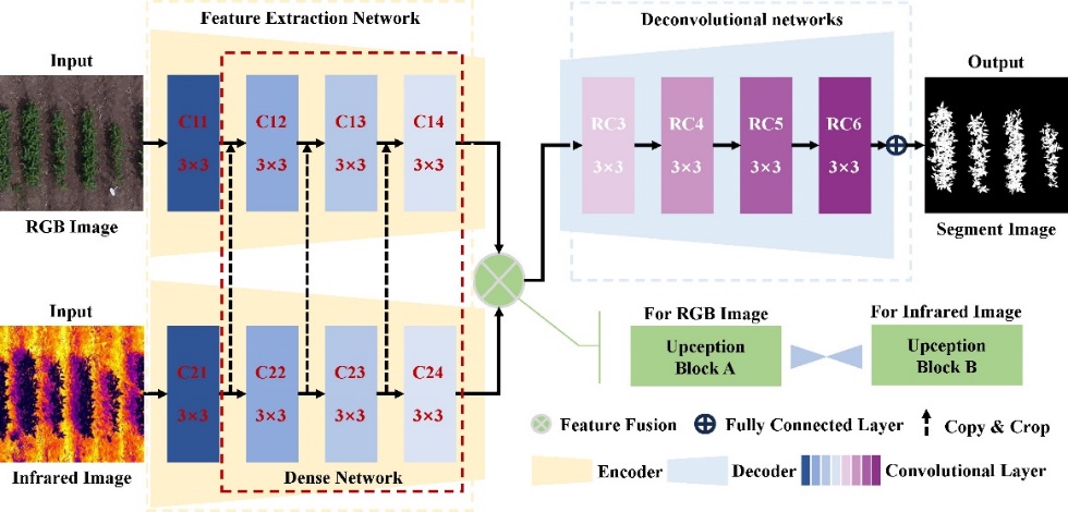 近日,中國科學院東北地理與農業(yè)生態(tài)研究所馮獻忠團隊從中國東北地區(qū)收集了200份代表性大豆品種,并利用無人機飛行系統(tǒng)采集了表型數(shù)據(jù)。為了克服高通量表型研究中遇到的挑戰(zhàn),設計了一個專門用于大豆田間冠層分割的多模態(tài)深度學習模型——RIFSeg-Net,并利用紅外信息提高無人機拍攝的RGB圖像中大豆冠層的分割精度。通過動態(tài)建模,利用時間序列無人機圖像數(shù)據(jù)提取并構建了與冠層發(fā)育動態(tài)相關的五個表型參數(shù)。該方法展示了典型的無人機高通量表型解21析過程,提出了對大豆生長模式和動態(tài)監(jiān)測的見解,并成功應用于田間大規(guī)模種質資源鑒定,為培育高產大豆品種提供了強有力的工具。
