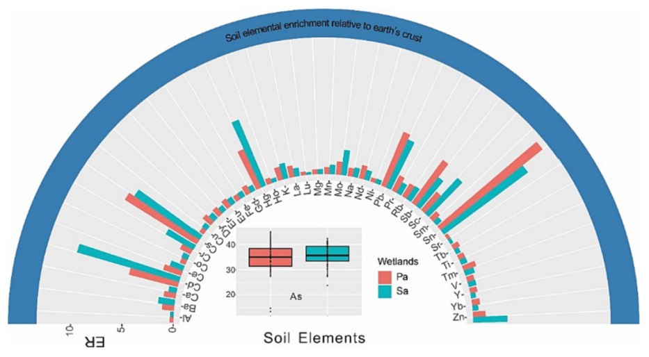 中國(guó)科學(xué)院東北地理與農(nóng)業(yè)生態(tài)研究所濕地生物與環(huán)境學(xué)科組研究人員通過(guò)對(duì)全國(guó)典型濱海濕地互花米草與蘆葦濕地進(jìn)行系統(tǒng)調(diào)查,對(duì)比分析了兩種濕地土壤中45種元素的地球化學(xué)集散狀況,并基于相關(guān)性系數(shù)矩陣構(gòu)建了量化多元素耦合程度的指標(biāo),探討了互花米草入侵對(duì)濱海濕地多元素耦合狀態(tài)的影響。