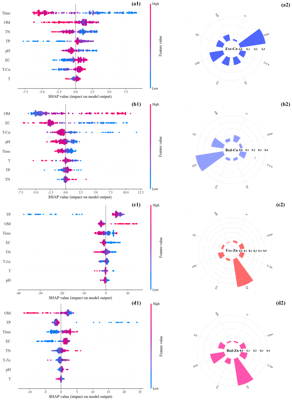 本研究基于課題組15年的數(shù)據(jù)累積及外部數(shù)據(jù)的收集,共取得260組數(shù)據(jù)。以堆肥過(guò)程中常見(jiàn)的物質(zhì)變化指標(biāo)(堆肥時(shí)間、溫度、pH、EC、OM、TP、TN和重金屬總量)為輸入因子,借助反向傳播神經(jīng)網(wǎng)絡(luò)(BPNN)、梯度增強(qiáng)回歸模型(GBR)、隨機(jī)森林模型(RF),建立了堆肥過(guò)程中重金屬形態(tài)快速預(yù)測(cè)模型,從而對(duì)重金屬有效性進(jìn)行評(píng)估。研究結(jié)果表明:BPNN、GBR和RF模型均能預(yù)測(cè)堆肥過(guò)程中Cu和Zn的形態(tài)分布(圖1),其中RF的預(yù)測(cè)性能最好,R2值為0.93-0.97。同時(shí),輸入因子的特征性分析表明(圖2),除堆肥時(shí)間外,OM和TP分別是預(yù)測(cè)Cu和Zn有效形態(tài)的最重要特征,降低OM或增加TP有助于提升堆肥中Cu和Zn的鈍化能力。本研究識(shí)別了Cu和Zn生物有效形態(tài)之間轉(zhuǎn)化的主要影響因子,為評(píng)估堆肥生產(chǎn)中重金屬生物有效性評(píng)估及調(diào)控提供了一種快速的決策工具;同時(shí)拓展了人工智能方法在有機(jī)固廢資源化領(lǐng)域的適用性,對(duì)于構(gòu)建生態(tài)安全的種養(yǎng)結(jié)合、農(nóng)牧循環(huán)新格局具有重要推動(dòng)意義。