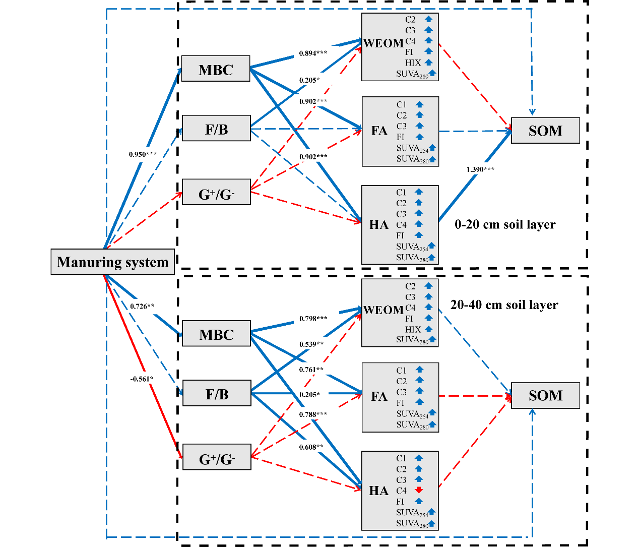 ????為此,東北地理所黑土保護與利用學科組研究人員利用長期定位實驗和三維熒光光譜、紫外光譜以及磷脂脂肪酸等技術,探究了長期施用有機物料對黑土溶解性有機質結構的影響。研究結果表明,長期施用有機物料可顯著提高SOM含量,且有機肥處理的效果優于秸稈還田。施用有機物料不僅提高了WEOM的芳香性,還顯著增加了HA和FA中的類富里酸和類胡敏酸組分,并通過增加穩定成分來提高SOM的穩定性(圖1)。此外,微生物群落的變化進一步凸顯了秸稈還田和有機肥對土壤微生物生物量的不同影響,其中有機肥處理表現出更高的磷脂脂肪酸(PLFAs)增長幅度。這表明有機物料對微生物群落有多方面的影響,真菌和細菌在土壤有機質的形成中發揮重要作用(圖2)。此外,長期施用有機物料對土壤WEOM、FA和HA的影響與土壤微生物生物量碳(MBC)和微生物群落結構密切相關。這種作用使其組成逐漸與微生物代謝相一致,強調了真菌和細菌的整體作用。偏最小二乘路徑模型(PLS-PM)分析顯示,HA和FA主要影響0-20 cm土層有機質含量的增加,而WEOM對20-40 cm土層有機質含量的增加起主導作用(圖3)。該研究通過探索長期施用有機物料對于土壤有機質含量和結構的影響,有助于深入了解微生物群落如何影響土壤中不同有機質組分的含量和結構。