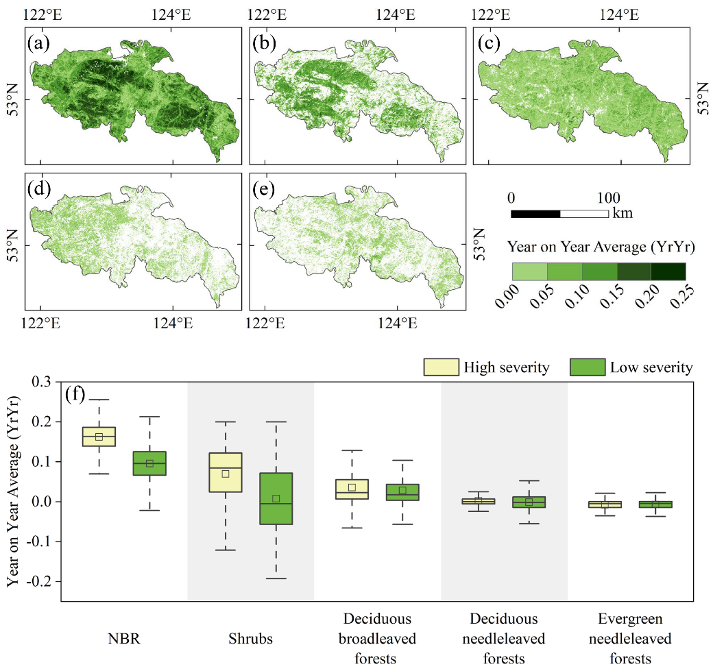 圖1. NBR指數(a)、灌木覆蓋率(b)、落葉闊葉林覆蓋率(c)、落葉針葉林覆蓋率(d)和常綠針葉林覆蓋率(e)的YrYr短期恢復指標空間模式及不同燃燒強度區域的對應YrYr統計(f)