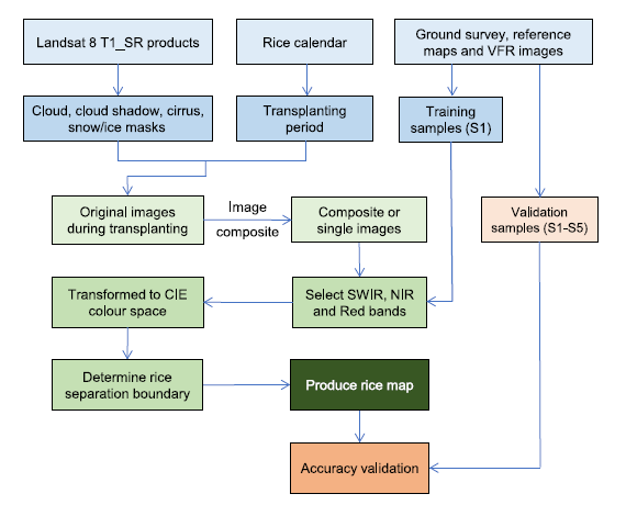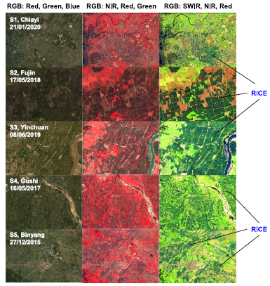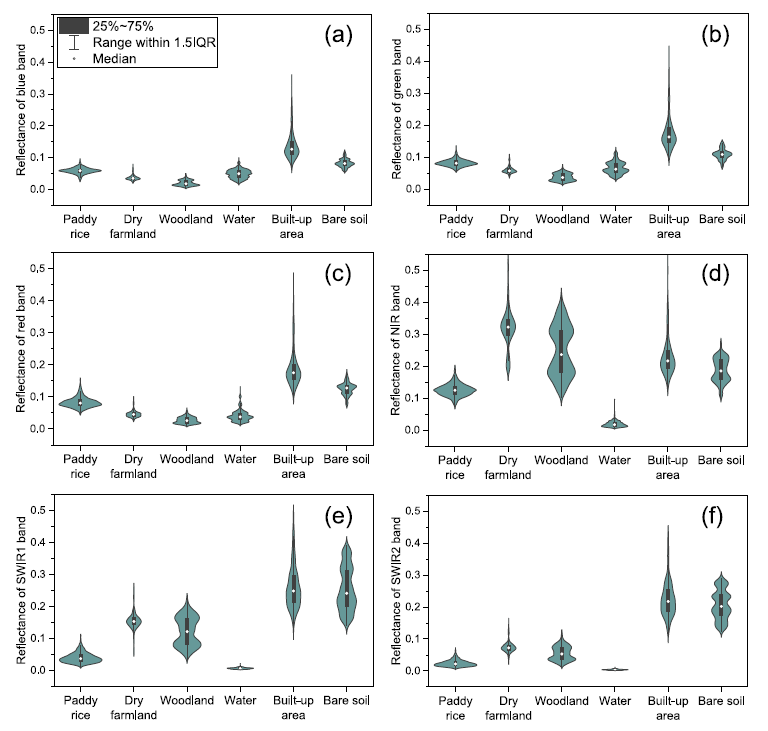 針對(duì)以上科學(xué)難題,中國(guó)科學(xué)院東北地理所李華朋副研究員帶領(lǐng)團(tuán)隊(duì),首次研發(fā)了一種全新的方法,命名為RiceTColour,旨在基于水稻在移栽期間的獨(dú)特光譜特征開(kāi)展水稻遙感制圖。通過(guò)分析水稻和其他土地覆蓋在可見(jiàn)光、近紅外和短波紅外波段的光譜分布特征,首次發(fā)現(xiàn)水稻在移栽期近紅外和短波紅外反射率值低于其他地物類型(除水體)的獨(dú)特特征;進(jìn)而,使用短波紅外、近紅外和紅色波段組合,水稻田在遙感影像上呈現(xiàn)獨(dú)特的顏色。