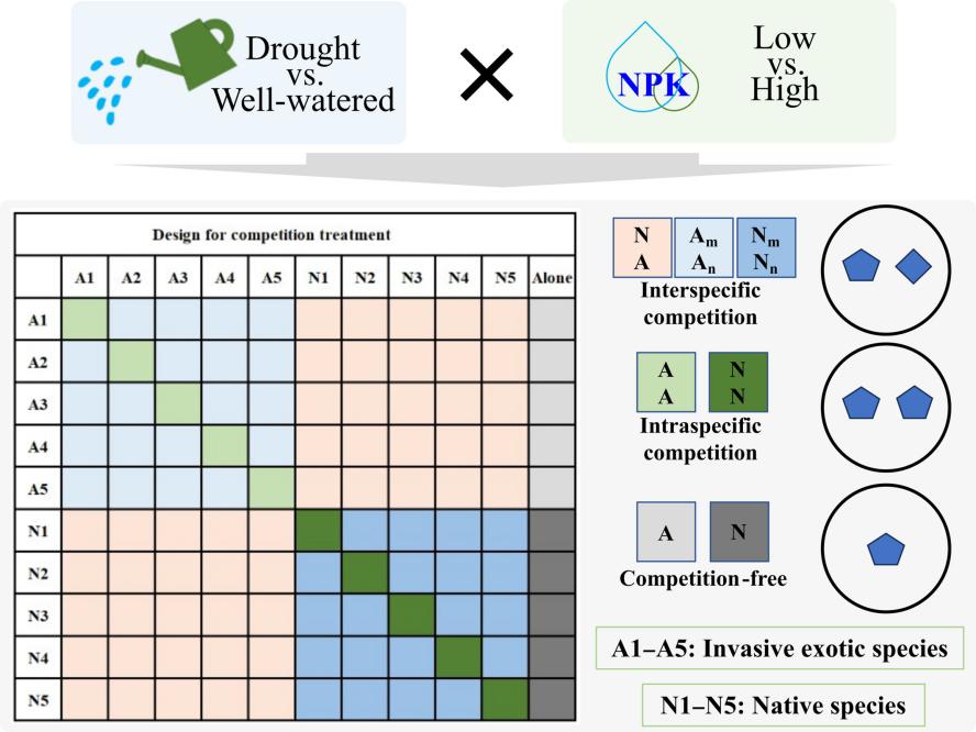 中國科學院東北地理與農業生態研究所的生物入侵生態學團隊通過溫室盆栽控制實驗,探討了多物種之間的相互作用機制,以解決上述科學問題(圖1)。實驗選取了5對入侵和本地植物物種作為研究對象,并設置了三種植物相互作用水平:(1)種內競爭,即目標植物與同種植物共同生長;(2)種間競爭,即目標植物與不同種的本地或入侵植物共同生長;(3)無競爭,即目標種單獨種植。這些植物間相互作用處理進一步與兩種土壤水分水平(干旱與充足水分)及兩種土壤養分水平(低養分與高養分)進行了全因子交互設置。