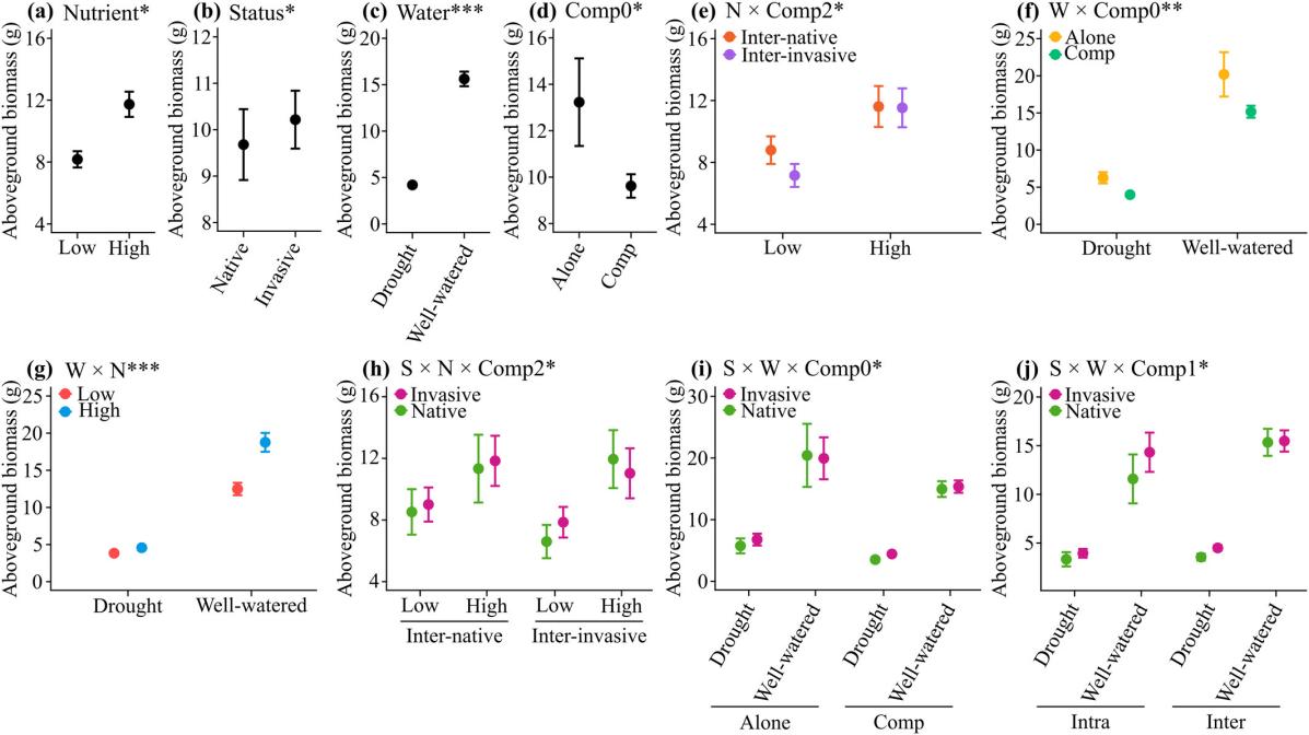 結果顯示,低養分條件下,與目標本地植物相比,目標入侵植物與其他入侵植物共同生長時獲得更大的地上生物量,而高養分條件下,目標入侵植物與其他入侵植物共同生長時表現較差(圖2h)。此外,低養分環境中,無論目標植物是否為入侵物種,本地競爭者促進目標植物的地上生物量(圖2e)。種間競爭中,干旱對本地目標植物生長的負面影響更顯著;而無論競爭類型如何,目標入侵植物與目標本地植物受干旱脅迫影響相似(圖2j)。
