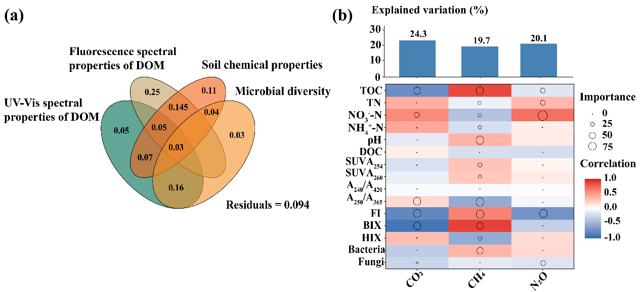 結果表明,不同類型的微塑料添加均顯著提高了土壤的碳養分與pH,但對土壤氮養分與DOM的化學多樣性的影響存在差異。三種微塑料添加均有效抑制了土壤CO2的累計排放量,其中低密度聚乙烯與聚丙烯添加能夠顯著抑制土壤N2O排放,降低全球增溫潛勢。DOM熒光特性、土壤化學性質和微生物多樣性指數是解釋溫室氣體排放的關鍵指標。