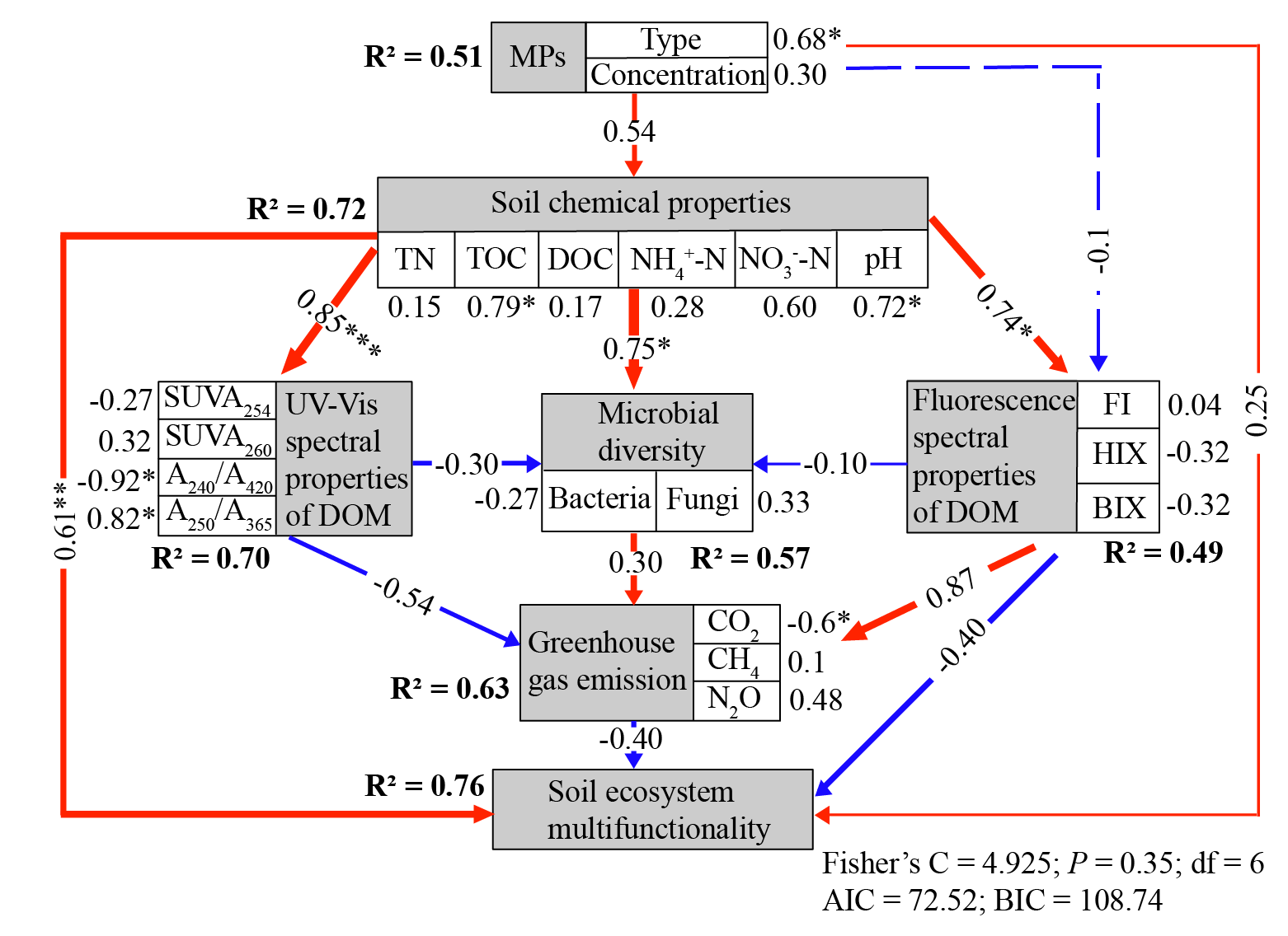 微塑料對土壤生態系統多功能性的影響取決于其聚合物類型和添加劑量,而土壤TOC、pH、DOM的A240/A420和A250/A365指數以及CO2排放是評估微塑料對土壤生態系統多功能性影響的重要指標。