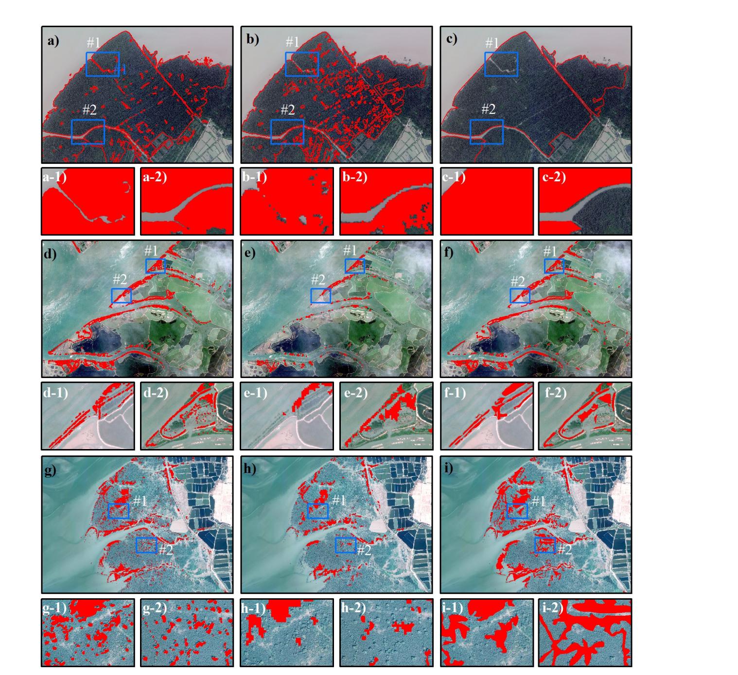 圖1 與現(xiàn)有的無瓣海桑地圖進行比較,重點分析代表性區(qū)域內(nèi)的差異。第一列為本研究繪制的個體水平無瓣海桑地圖,第二列是使用Sentinel-2圖像和隨機森林算法獲取的分布結(jié)果,第三列是基于野外調(diào)查和谷歌地球影像進行視覺解釋得到的分布結(jié)果。