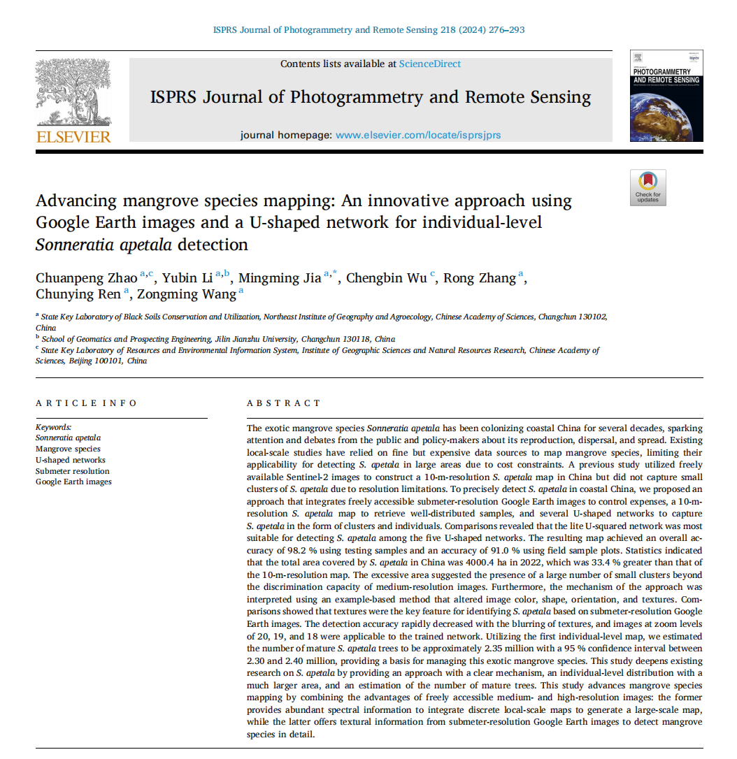 無瓣海桑(Sonneratia apetala)是紅樹林優(yōu)良喬木樹種,為了恢復因沿海開發(fā)而受損的紅樹林,該紅樹林樹種已在中國被廣泛引種以用于造林和再造林。然而,無瓣海桑具有一定的競爭和擴散能力,其潛在的入侵能力引起了我國學者的廣泛擔憂和關(guān)注。中國科學院東北地理所地理景觀遙感學科組的趙傳朋和賈明明副研究員為解決遙感影像成本限制對精細化紅樹林物種制圖的影響,提出了將亞米分辨率谷歌地球影像和深度學習相結(jié)合的無瓣海桑提取新方法,發(fā)表論文“Advancing mangrove species mapping: An innovative approach using Google Earth images and a U-shaped network for individual-level Sonneratia apetala detection”。應(yīng)用上述方法,以公開且免費獲取的谷歌地球影像為數(shù)據(jù)源,建立亞米分辨率的2022年中國無瓣海桑空間分布數(shù)據(jù)集。