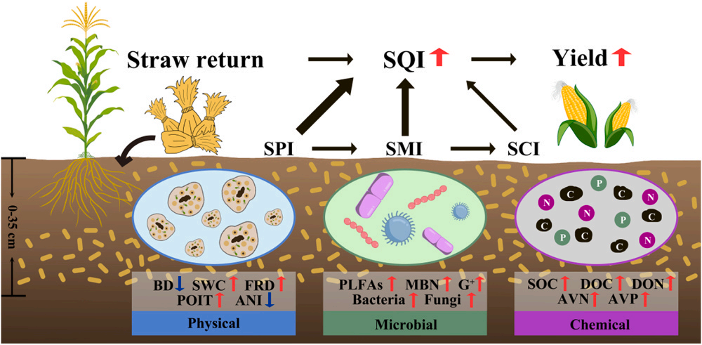 東北地理所黑土保護與利用學科組研究人員依托位于黑土區(qū)的秸稈還田長期定位試驗,探究了秸稈還田深度對土壤質(zhì)量和玉米產(chǎn)量的影響,通過分析土壤物理性質(zhì)指數(shù)(SPI)、化學性質(zhì)指數(shù)(SCI)和微生物性質(zhì)指數(shù)(SMI)與土壤質(zhì)量指數(shù)(SQI)和作物產(chǎn)量的關(guān)系,解析了適宜的秸稈還田方式在改善土壤質(zhì)量、提升玉米產(chǎn)量方面的驅(qū)動機制,研究結(jié)果對提高土壤質(zhì)量和制定可持續(xù)農(nóng)業(yè)發(fā)展策略具有重要指導意義。