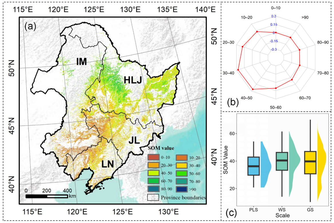 圖1.(a)東北黑土區(qū)SOM空間分布(HLJ:黑龍江:JL:吉林;LN:遼寧;IM:內(nèi)蒙古);(b)不同含量有機(jī)質(zhì)區(qū)域面積占比;(3)不同尺度下SOM含量平均值